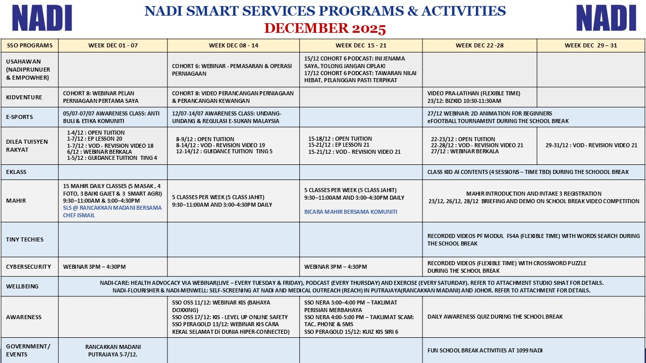 Tarikh 22 November 2025 Masa 2.30 pm -4.40 pm Lokasi NADI Kampung Parit Baru Baruh Peserta 2 orang TUJUAN Webinar Gerak Gempur SPM Bahasa Melayu AKTIVITI – Webinar gerak gempur untuk SPM secara live untuk subjek Bahasa Melayu bersama guru […]